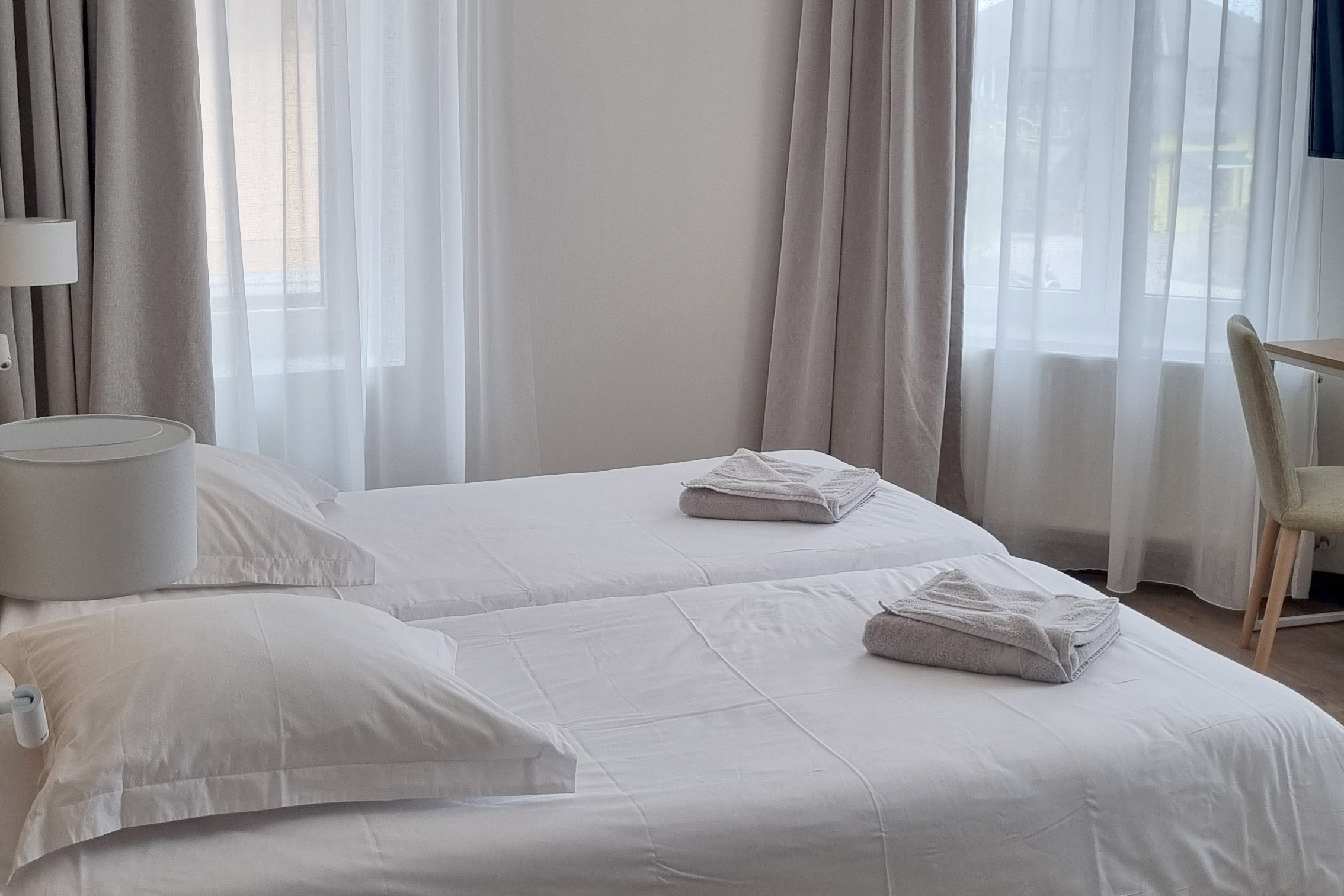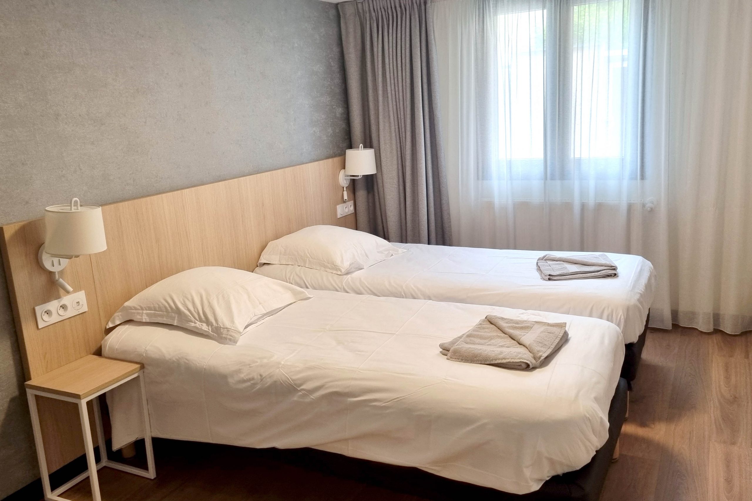 Chambre standard avec un grand lit ou deux lits jumeaux. Salle d’eau avec douche à l’italienne, WC, grand téléviseur, WiFi gratuit illimité, coin bureau.
