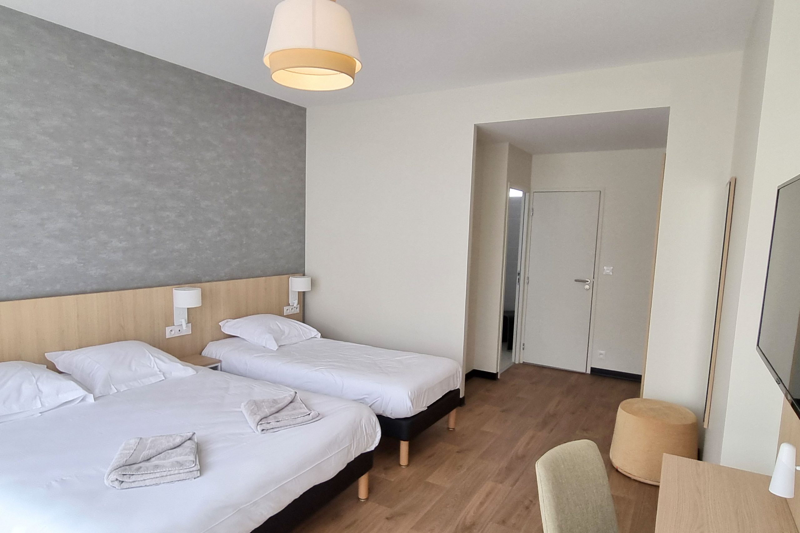 Chambre standard avec un grand lit et un petit lit. Salle d’eau avec douche à l’italienne, WC, grand téléviseur, WiFi gratuit illimité, coin bureau.